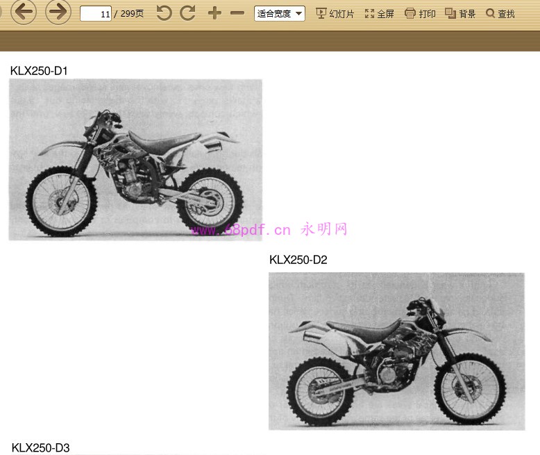----- 资料详情 ----- 资料预览:请看截图. 资料简介:PDF格式 英文 16M 1993-1997 川崎KLX250 KLX300 D1-D4 E1-E3 本文网址:http://www.68pdf.cn/a/130.html 欢迎分享本文,分享时请保留出处! Time :01-26 3人喜欢 分享/收藏:喜欢的朋友,记得复制网址 收藏本文!