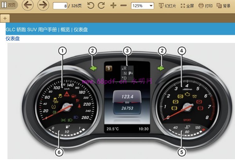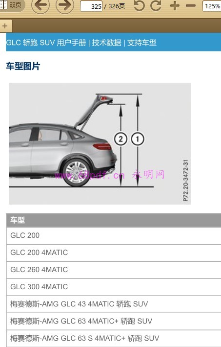 ----- 资料详情 ----- 资料预览:请看截图. 资料简介:PDF格式 包括以下车型:GLC 轿跑 SUV GLC 200 GLC 200 4MATIC GLC 260 4MATIC GLC 300 4MATIC AMG GLC 43 4MATIC AMG GLC 63 S 4MATIC+ ★此手册为内部资料,仅供车主阅读使用。不建议打印,因为是A4的大小,打印时没页码的。★ 本文网址:http://www.68pdf.cn/a/136.html 欢迎分享本文,分享时请保留出处! Time :02-01 3人喜欢 分享/收藏:喜欢的朋友,记得复制网址 收藏本文!