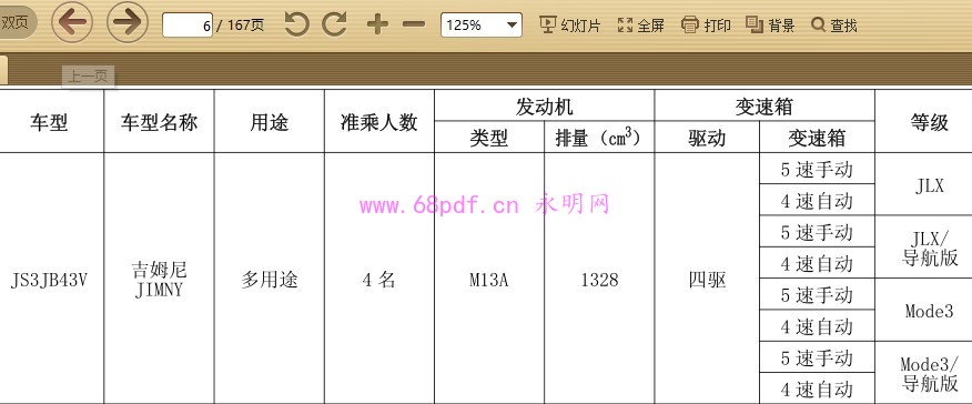 ----- 资料详情 ----- 资料预览:请看截图. 资料简介:PDF格式 车型 JS3JB43V 5速手动 4速自动 JLX JLX/导航版 Mode3 Mode3/导航版 本文网址:http://www.68pdf.cn/a/56.html 欢迎分享本文,分享时请保留出处! Time :07-25 3人喜欢 分享/收藏:喜欢的朋友,记得复制网址 收藏本文!